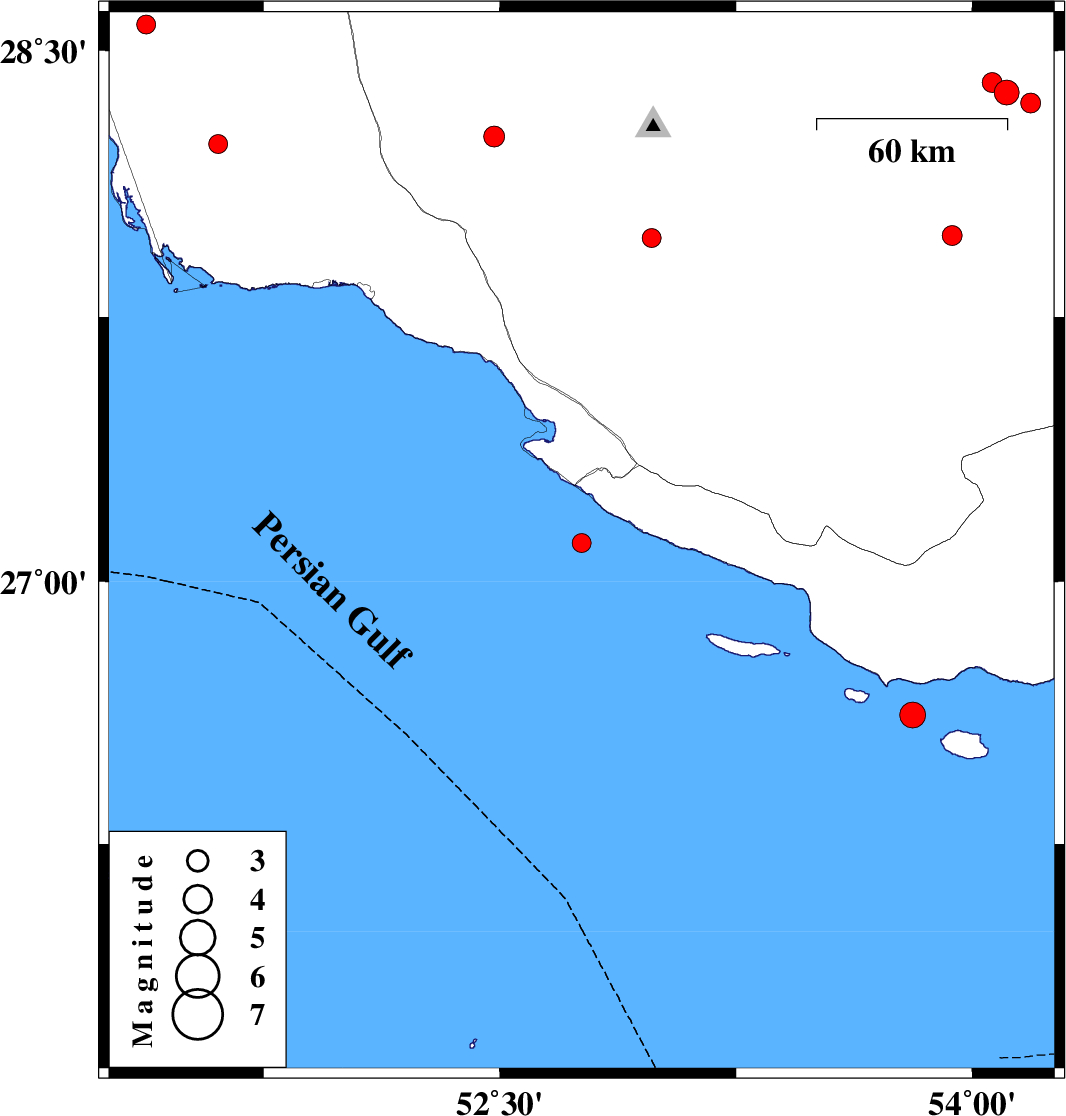 | 2017/06/25 | 02:30:07.2 | 07:00:07.2 | 27.972 | 52.983 | 14 | ML2.7 | Fars Province, 48 km North of Mehr | ||