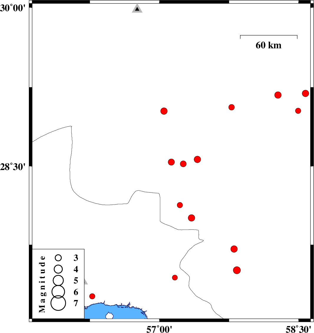| 2017/07/04 | 03:59:59.3 | 08:29:59.3 | 28.539 | 57.128 | 6 | ML3.1 | Kerman Province, 61 km South-West of Jiroft | ||