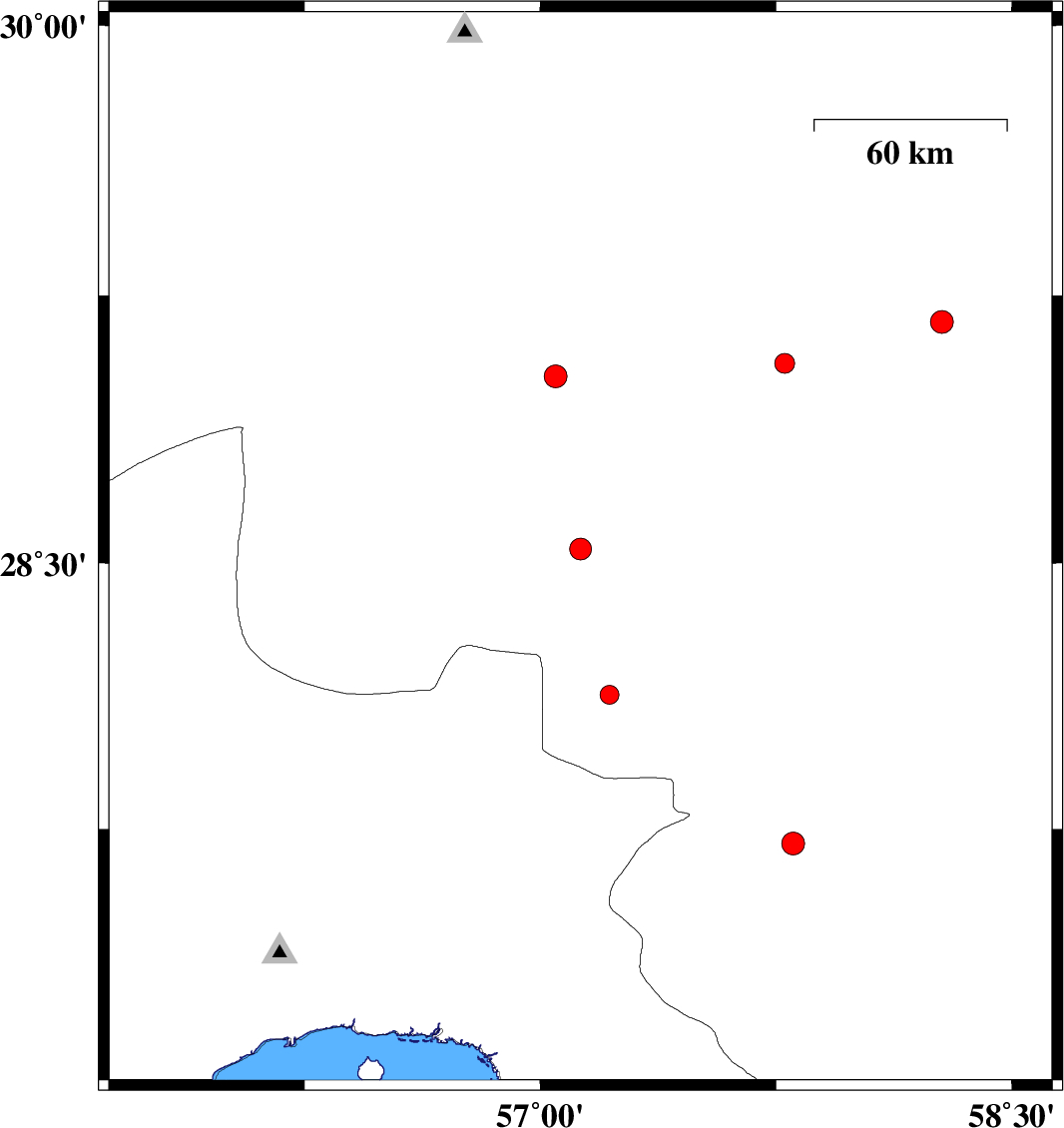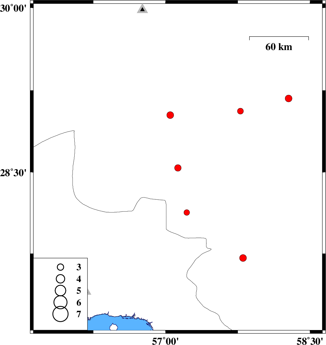 | 2017/07/04 | 03:59:59.3 | 08:29:59.3 | 28.539 | 57.128 | 6 | ML3.1 | Kerman Province, 61 km South-West of Jiroft | ||
