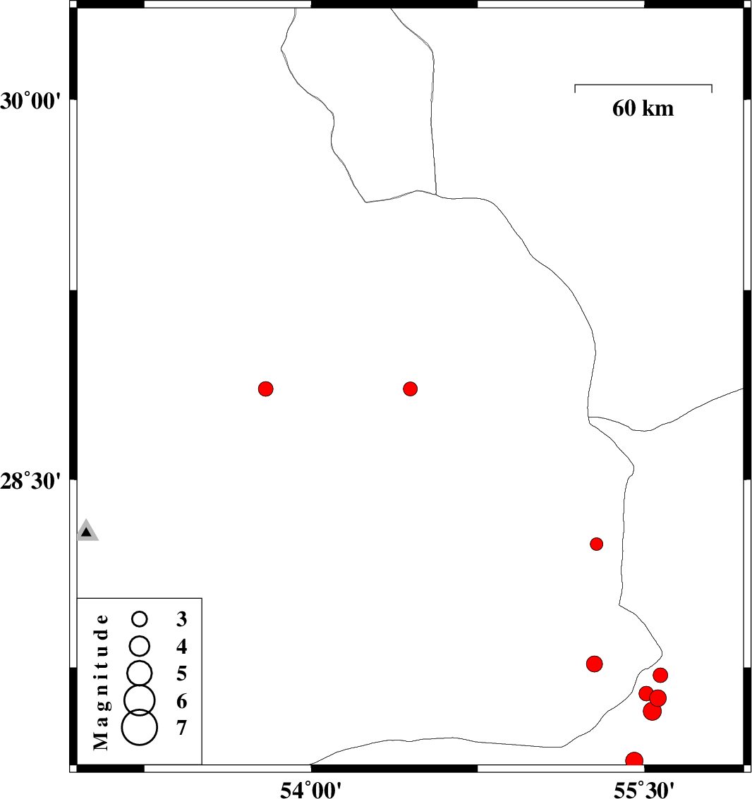 | 2017/06/25 | 02:30:07.2 | 07:00:07.2 | 27.972 | 52.983 | 14 | ML2.7 | Fars Province, 48 km North of Mehr | ||
