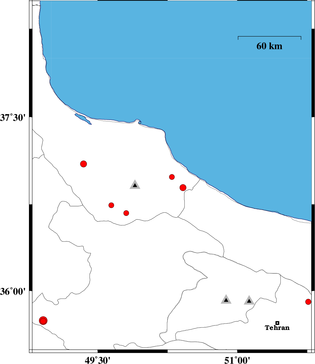 | 2017/06/16 | 02:26:52.7 | 06:56:52.7 | 36.742 | 49.645 | 7 | ML2.5 | Gilan Province, 21 km -East of Rudbar | ||