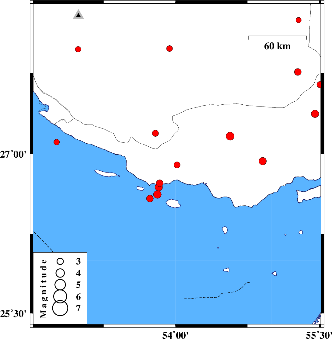 | 2017/06/09 | 09:45:56.4 | 14:15:56.4 | 26.62 | 53.811 | 14 | ML3.7 | Persian Gulf, 84 km South-West of Bastak | ||