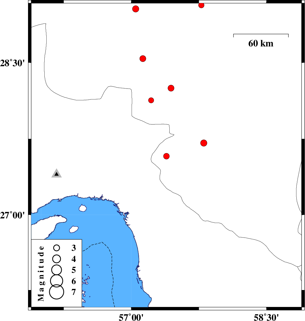 | 2017/07/04 | 03:59:59.3 | 08:29:59.3 | 28.539 | 57.128 | 6 | ML3.1 | Kerman Province, 61 km South-West of Jiroft | ||