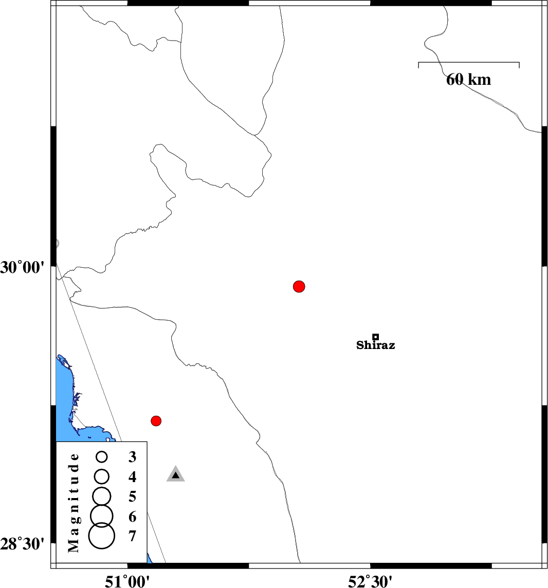 | 2017/06/14 | 06:00:27.6 | 10:30:27.6 | 29.164 | 51.177 | 14 | ML2.8 | Bushehr Province, 11 km of Borazjan |
