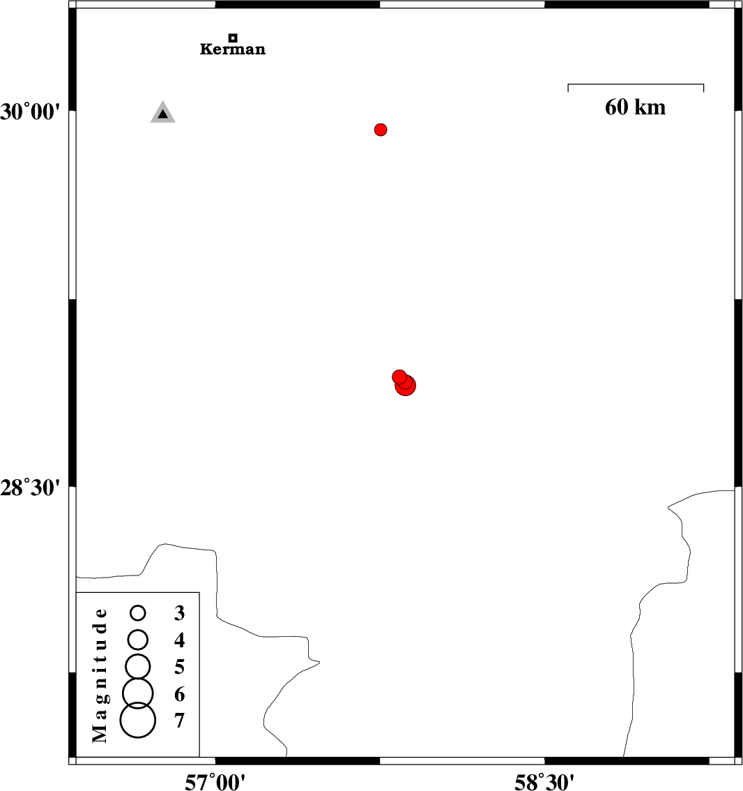 | 2017/07/15 | 18:18:15.5 | 22:48:15.5 | 28.906 | 57.865 | 14 | ML4.2 | Kerman Province, 29 km North-East of Jiroft | ||