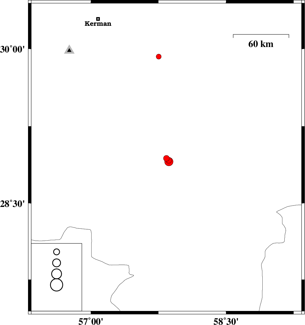 2017/07/13 | 23:29:36.5 | 03:59:36.5 | 29.925 | 57.753 | 18 | ML:2.6 | Kerman Province, 76 km South-East of Kerman |
