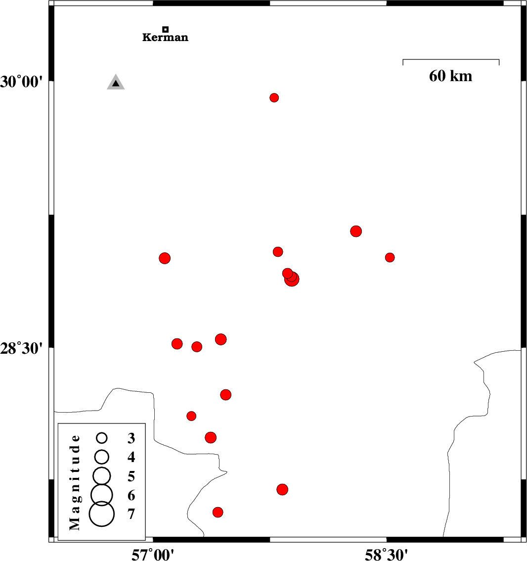 | 2017/07/04 | 03:59:59.3 | 08:29:59.3 | 28.539 | 57.128 | 6 | ML3.1 | Kerman Province, 61 km South-West of Jiroft | ||