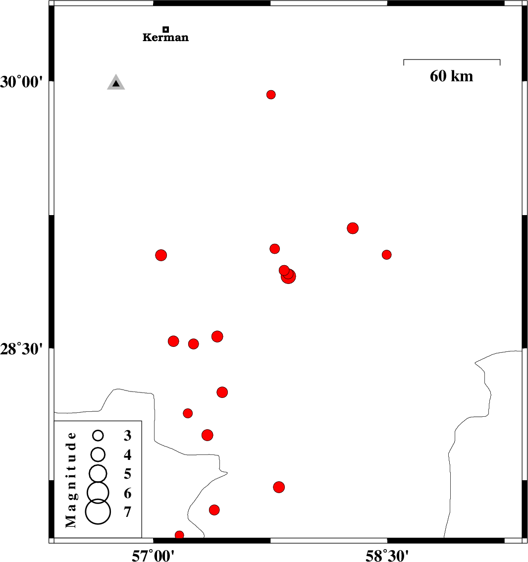 | 2017/06/17 | 09:07:54.2 | 13:37:54.2 | 28.007 | 57.345 | 15 | ML3.2 | Kerman Province, 35 km -West of Kahnuj | ||