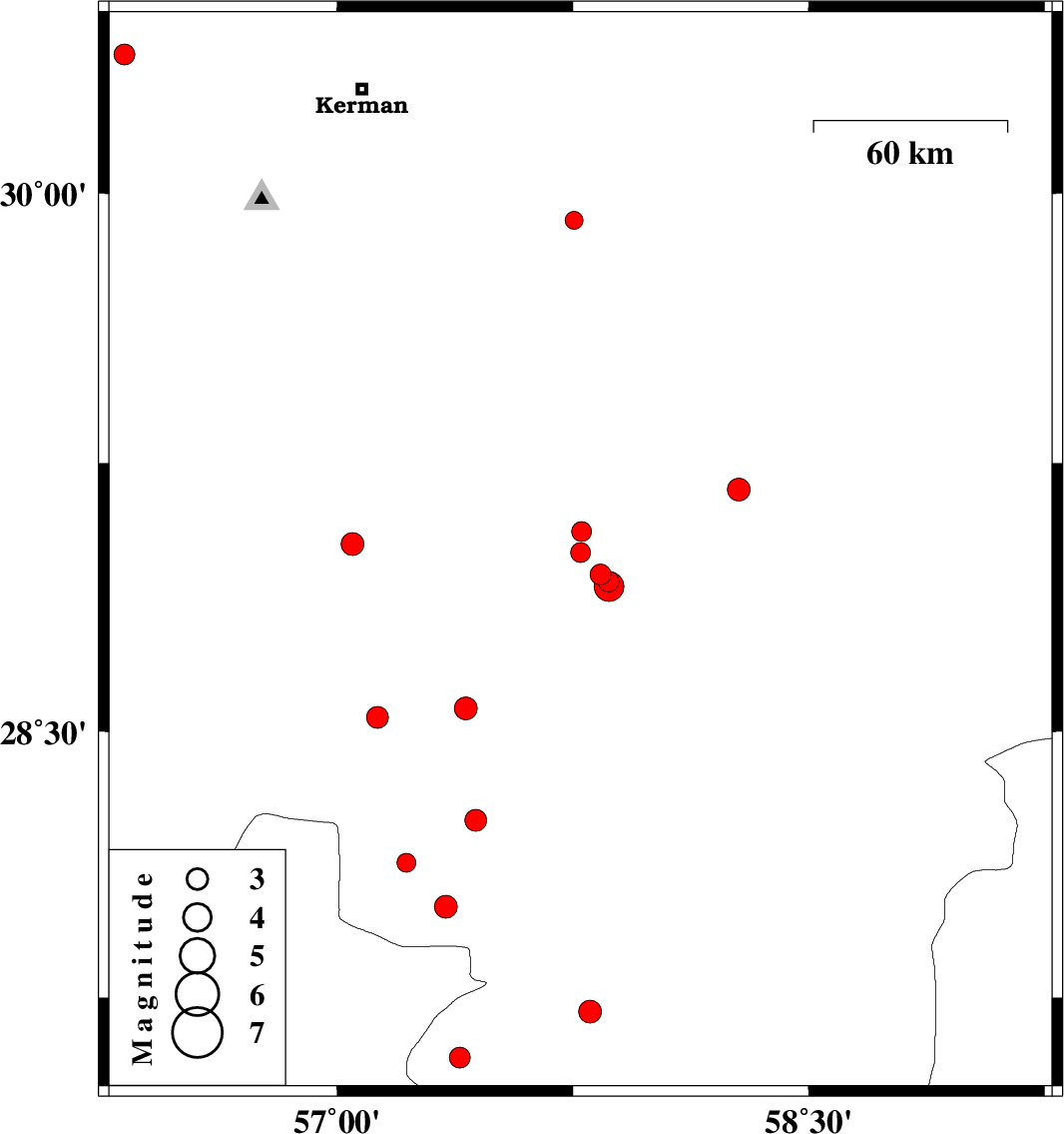 | 2017/06/17 | 09:07:54.2 | 13:37:54.2 | 28.007 | 57.345 | 15 | ML3.2 | Kerman Province, 35 km -West of Kahnuj |