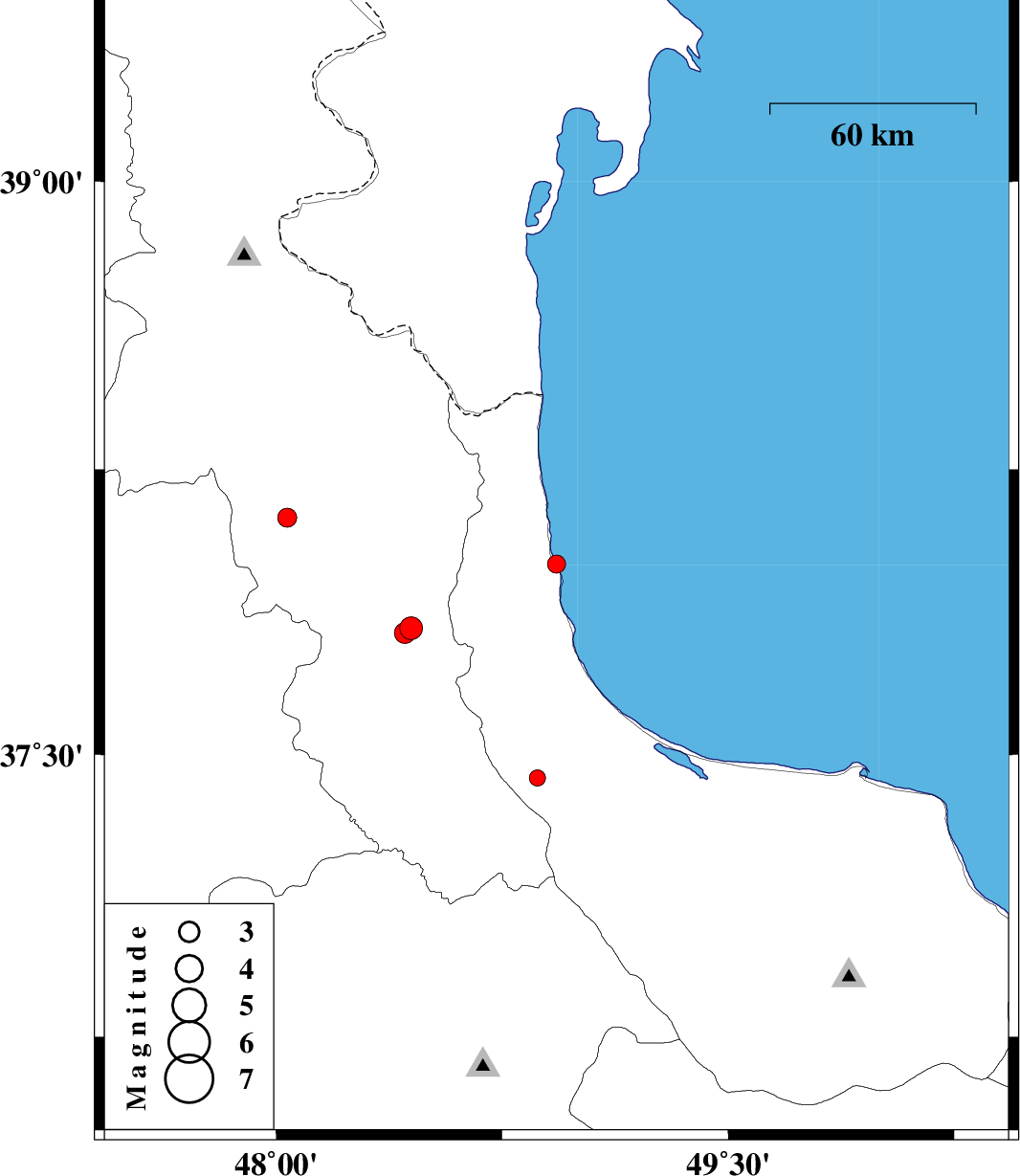 | 2017/07/19 | 01:57:22.9 | 06:27:22.9 | 38.002 | 48.93 | 14 | ML2.7 | Caspian Sea, 23 km North of Hashtpar | ||