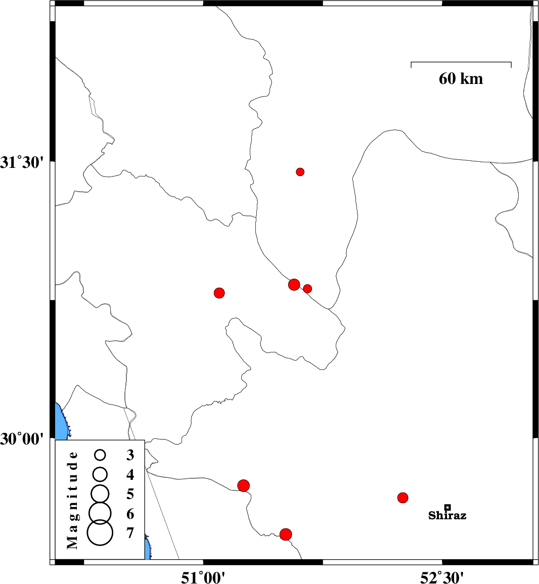 | 2017/07/15 | 00:00:22.1 | 04:30:22.1 | 29.672 | 52.252 | 14 | ML3 | Fars Province, 28 km -West of Shiraz | ||