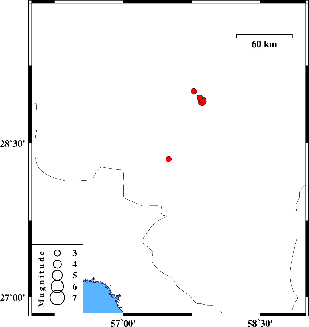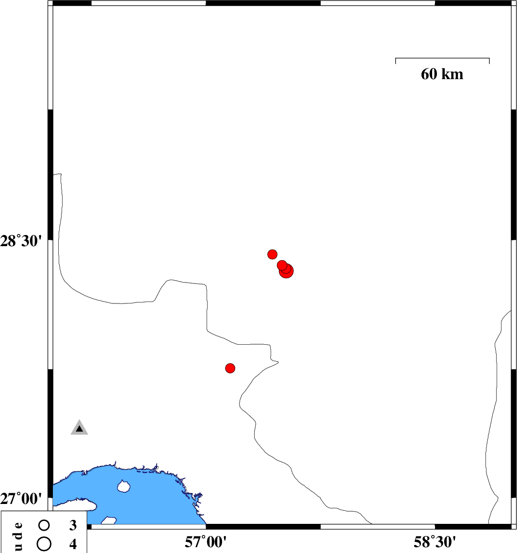 | 2017/07/15 | 18:18:15.5 | 22:48:15.5 | 28.906 | 57.865 | 14 | ML4.2 | Kerman Province, 29 km North-East of Jiroft |