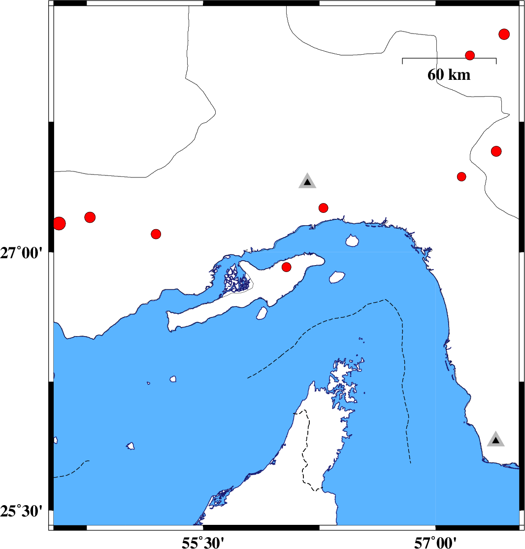 2017/07/12 | 07:59:58.7 | 12:29:58.7 | 27.105 | 55.196 | 18 | ML:2.8 | Hormozgan Province, 83 km -East of Bastak | ||