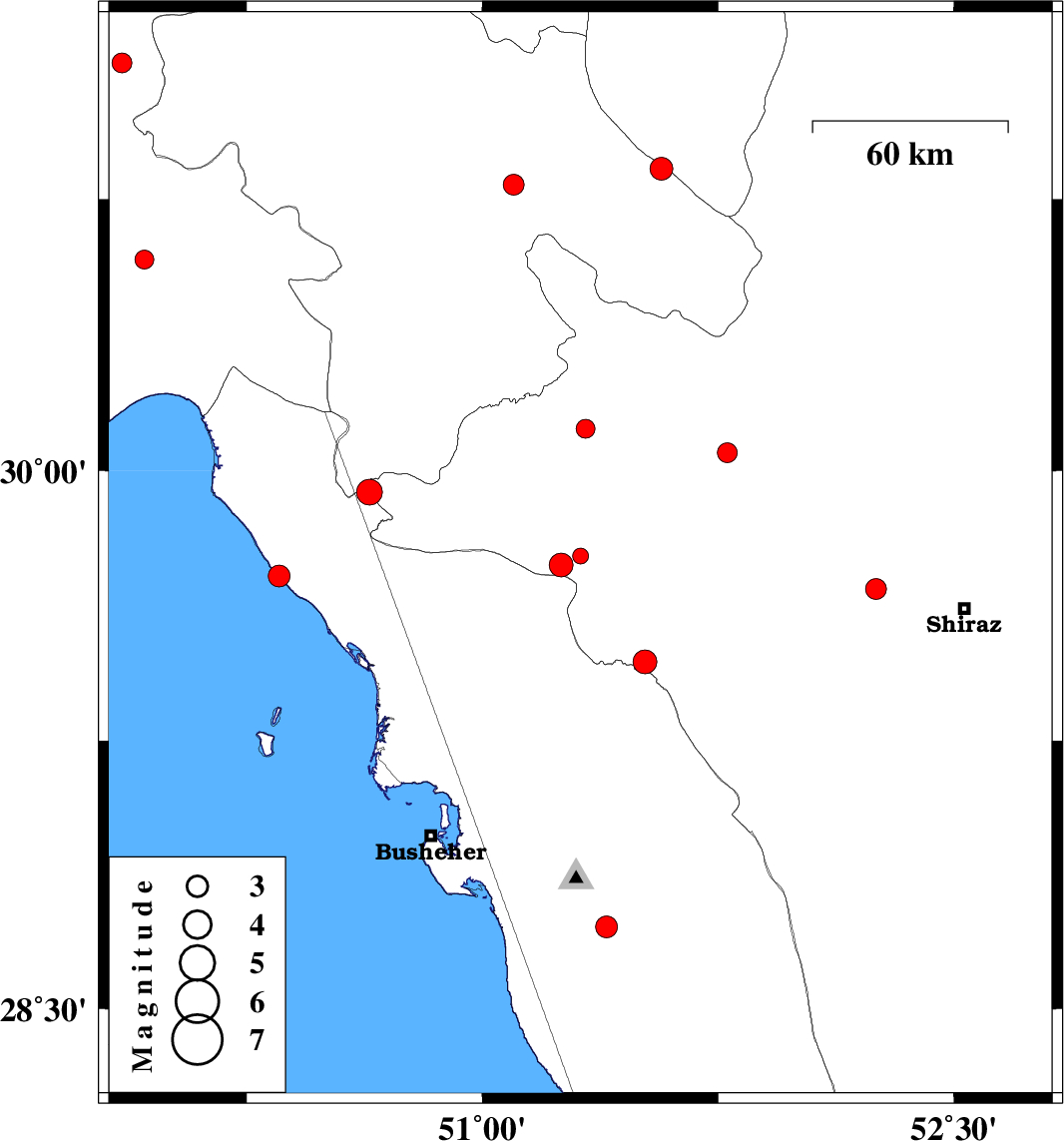 2017/07/16 | 08:28:20.1 | 12:58:20.1 | 29.47 | 51.517 | 14 | ML:3.4 | Fars Province, 21 km South-West of Kazerun | ||