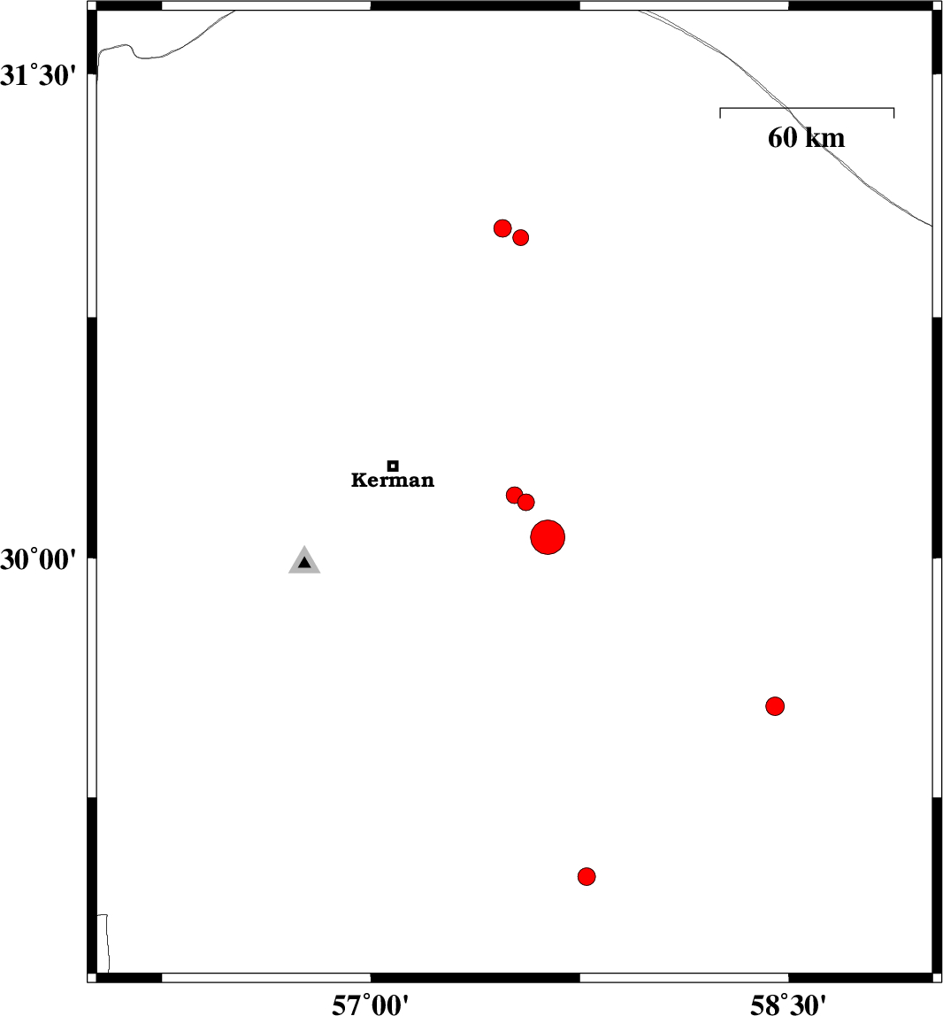 2017/07/23 | 17:32:12.3 | 22:02:12.3 | 30.065 | 57.634 | 11 | Mb:5.5 | Kerman Province, 59 km South-East of Kerman | ||
