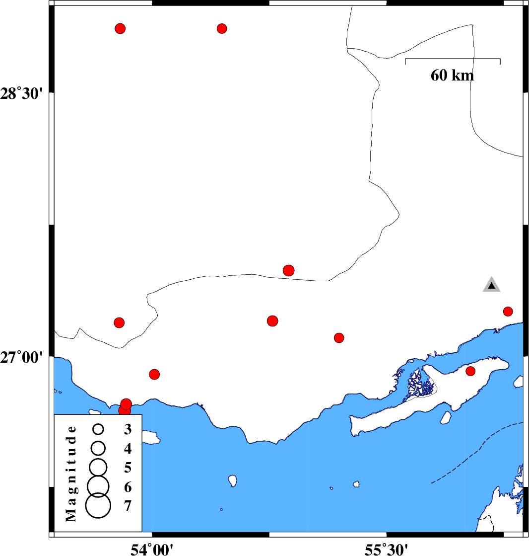 | 2017/07/02 | 06:19:50.3 | 10:49:50.3 | 26.688 | 53.824 | 14 | ML3.5 | Persian Gulf, 78 km South-West of Bastak | ||