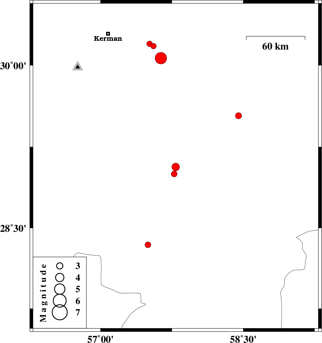 2017/07/23 | 17:32:12.3 | 22:02:12.3 | 30.065 | 57.634 | 11 | Mb:5.5 | Kerman Province, 59 km South-East of Kerman | ||