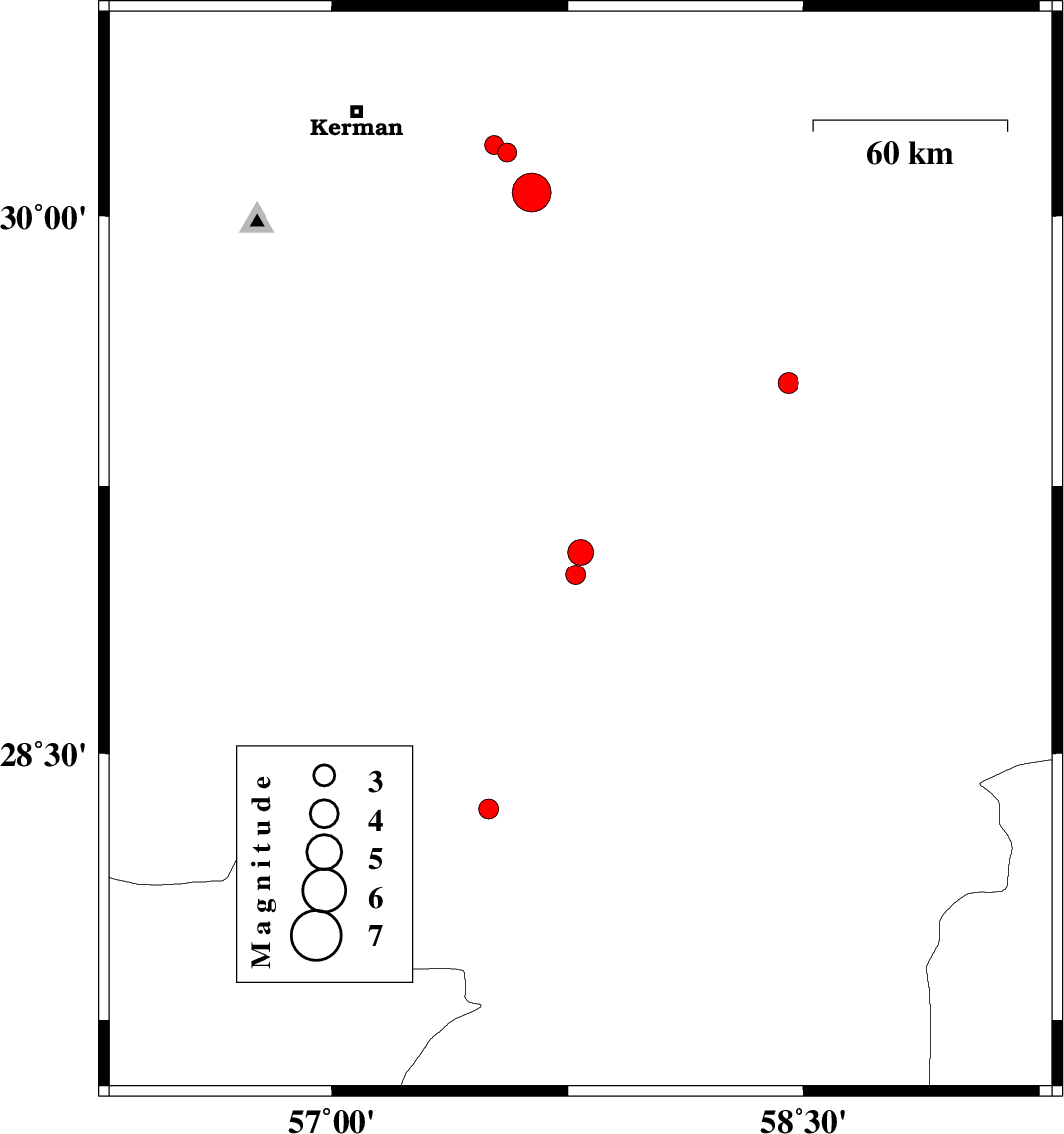 | 2017/07/23 | 17:32:12.3 | 22:02:12.3 | 30.065 | 57.634 | 11 | Mb5.5 | Kerman Province, 59 km South-East of Kerman | ||