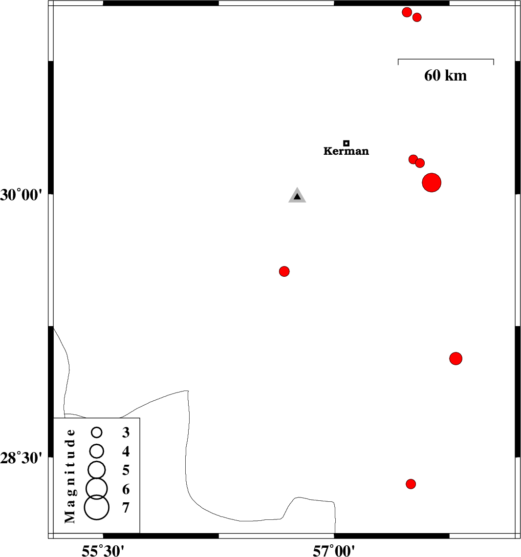 | 2017/07/23 | 17:32:12.3 | 22:02:12.3 | 30.065 | 57.634 | 11 | Mb5.5 | Kerman Province, 59 km South-East of Kerman | ||