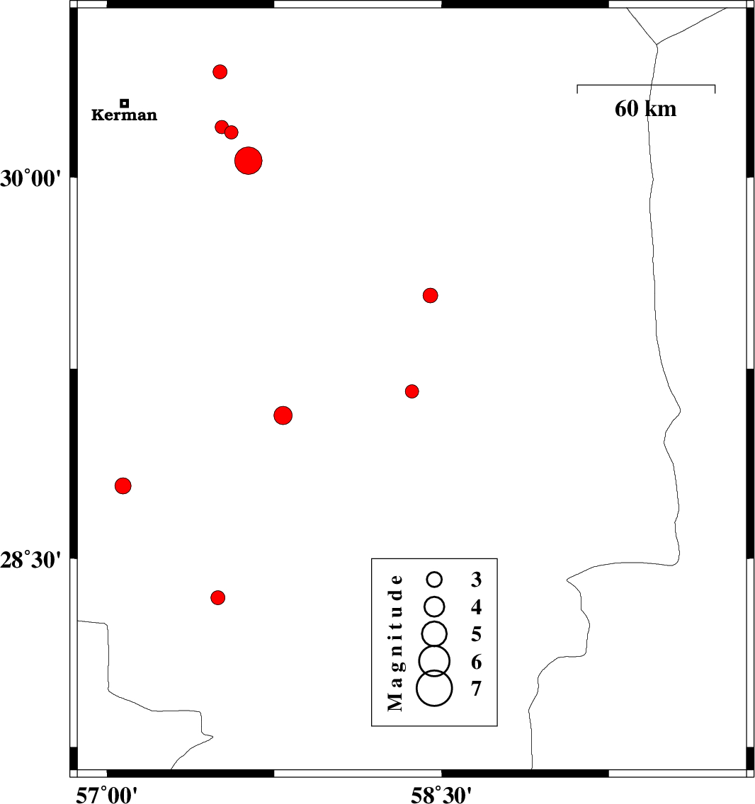 2017/07/23 | 17:32:12.3 | 22:02:12.3 | 30.065 | 57.634 | 11 | Mb5.5 | Kerman Province, 59 km South-East of Kerman | ||