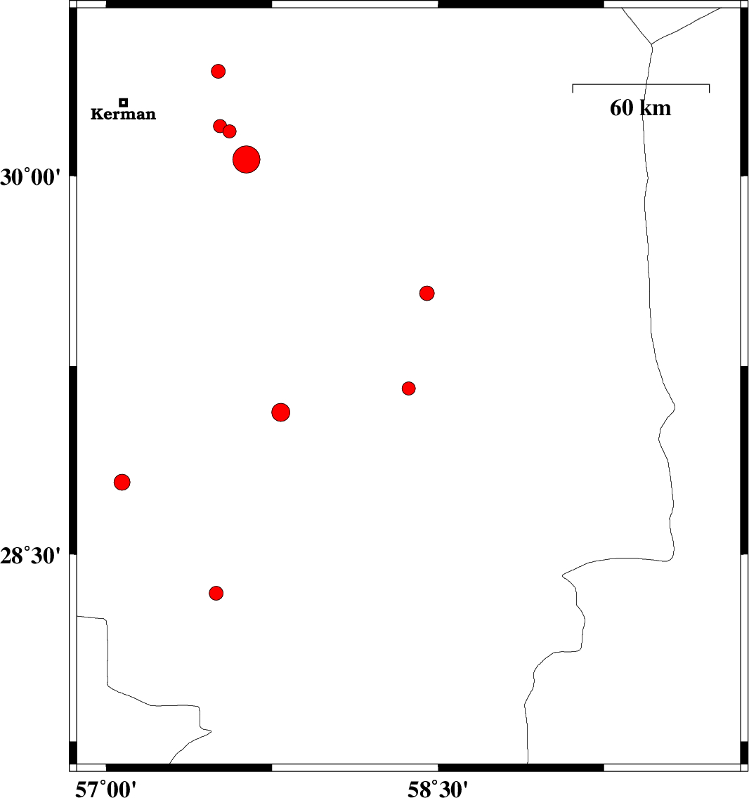 | 2017/07/23 | 17:32:12.3 | 22:02:12.3 | 30.065 | 57.634 | 11 | Mb5.5 | Kerman Province, 59 km South-East of Kerman | ||