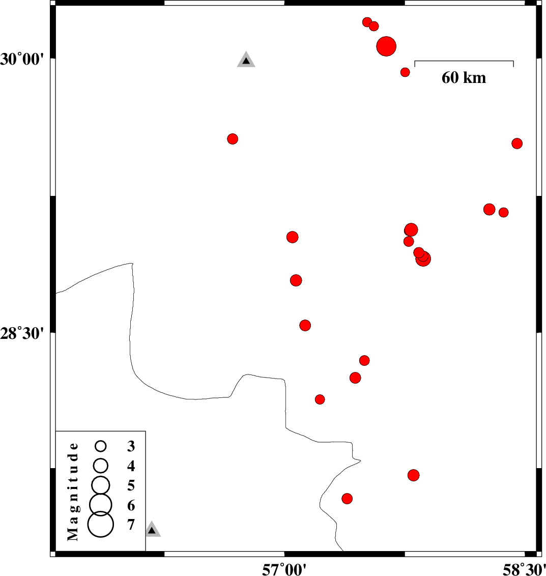 | 2017/07/23 | 17:32:12.3 | 22:02:12.3 | 30.065 | 57.634 | 11 | Mb5.5 | Kerman Province, 59 km South-East of Kerman | ||
