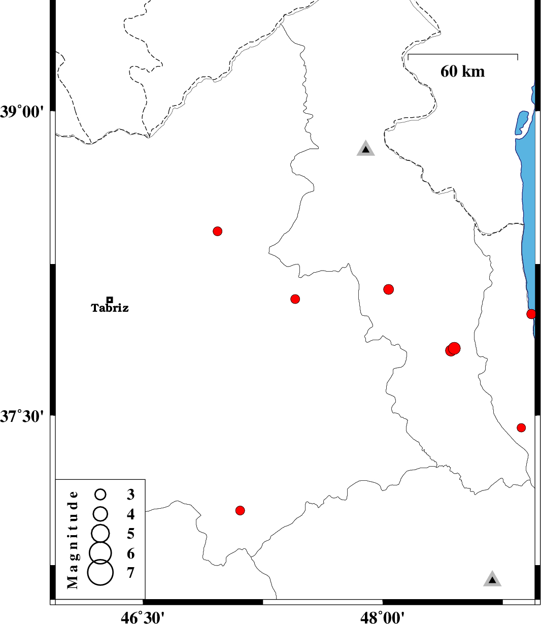 | 2017/07/12 | 21:42:04.7 | 02:12:04.7 | 37.821 | 48.427 | 15 | ML3.1 | Ardebil Province, 14 km North of Givi |