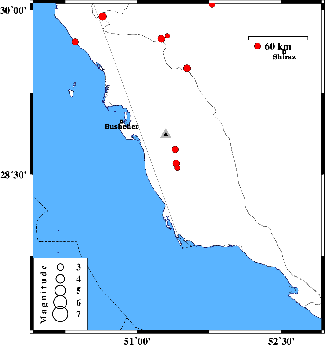| 2017/07/29 | 14:29:56.1 | 18:59:56.1 | 28.559 | 51.417 | 15 | ML2.6 | Bushehr Province, 11 km of Khormog | ||
