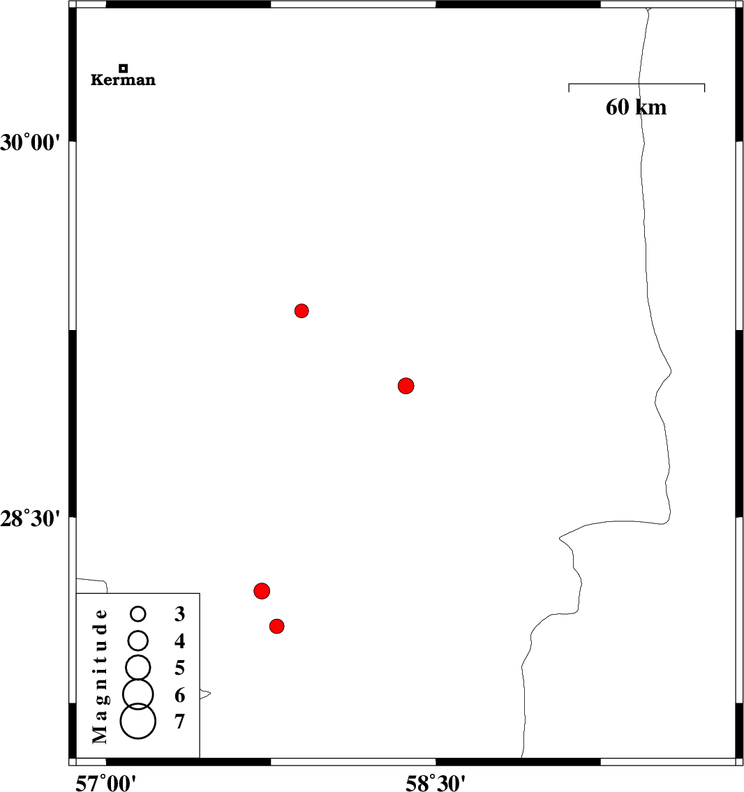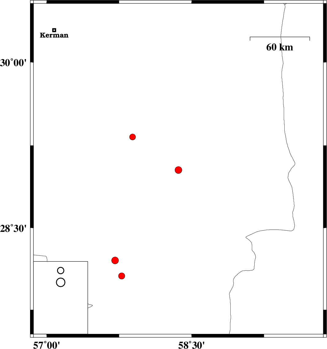 | 2017/05/26 | 06:33:51.6 | 11:03:51.6 | 28.203 | 57.709 | 14 | ML3.3 | Kerman Province, 28 km North of Kahnuj |