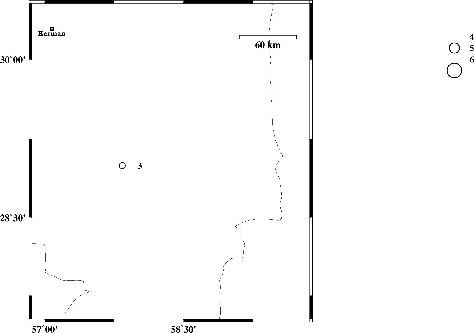 2017/05/26 | 06:33:51.6 | 11:03:51.6 | 28.203 | 57.709 | 14 | ML3.3 | Kerman Province, 28 km North of Kahnuj |