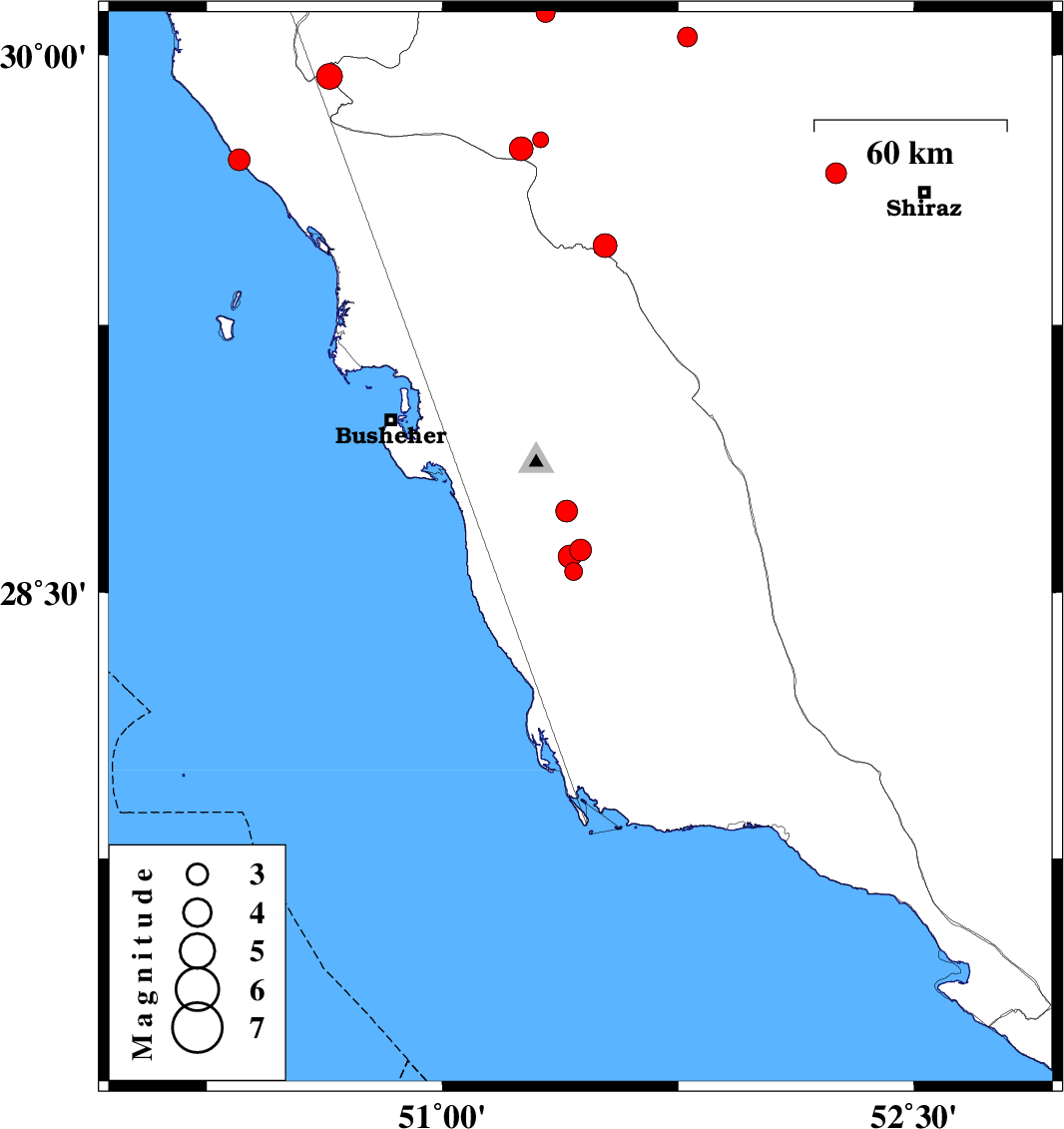 | 2017/07/29 | 14:29:56.1 | 18:59:56.1 | 28.559 | 51.417 | 15 | ML2.6 | Bushehr Province, 11 km of Khormog | ||