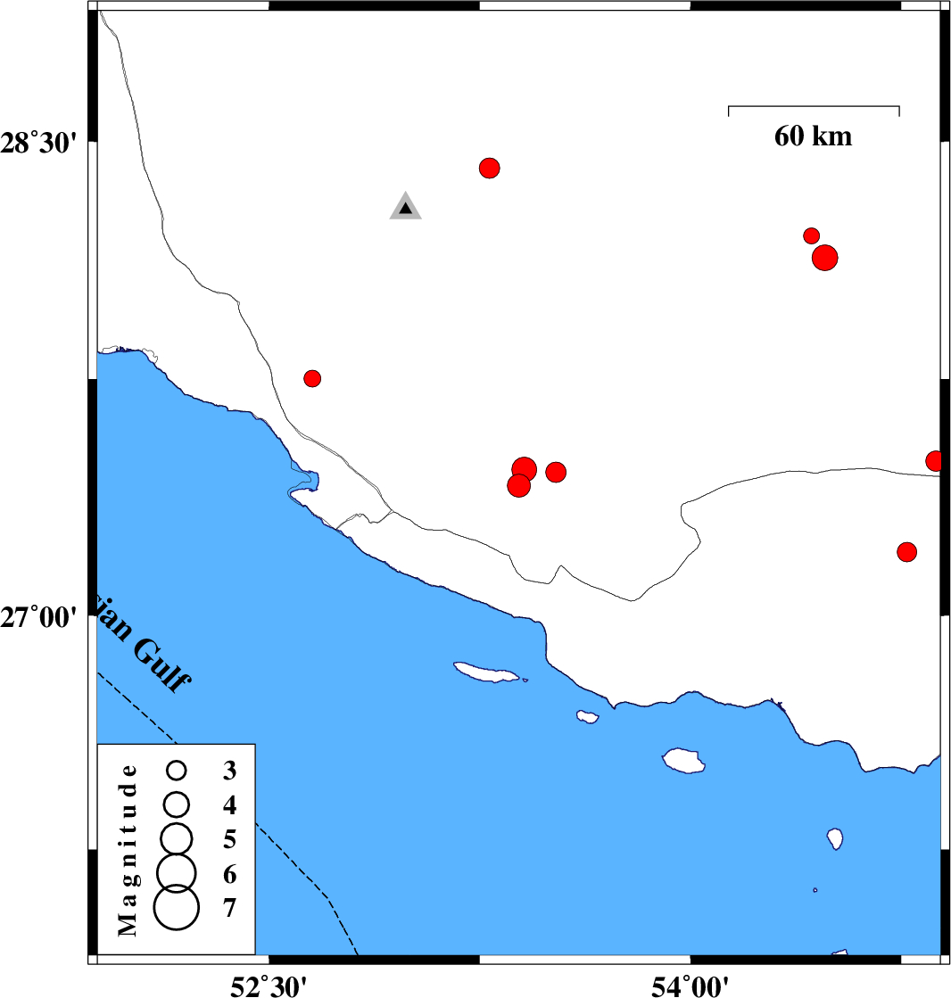 2017/07/27 | 02:50:43.6 | 07:20:43.6 | 28.416 | 53.285 | 6 | ML3.2 | Fars Province, 25 km -East of Qir va Karzin | ||