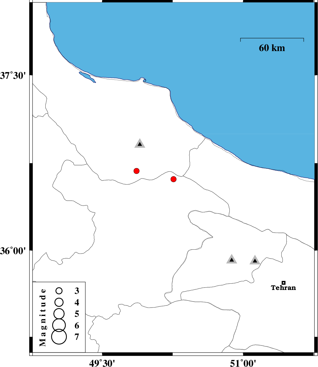 | 2017/08/12 | 06:25:56.2 | 10:55:56.2 | 36.613 | 50.259 | 15 | ML2.7 | Ghazvin Province, 58 km South of Rudsar | ||