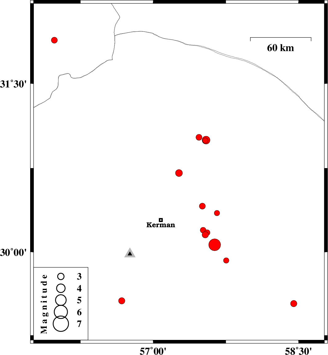 | 2017/07/23 | 17:32:12.3 | 22:02:12.3 | 30.065 | 57.634 | 11 | Mb5.5 | Kerman Province, 59 km South-East of Kerman | ||