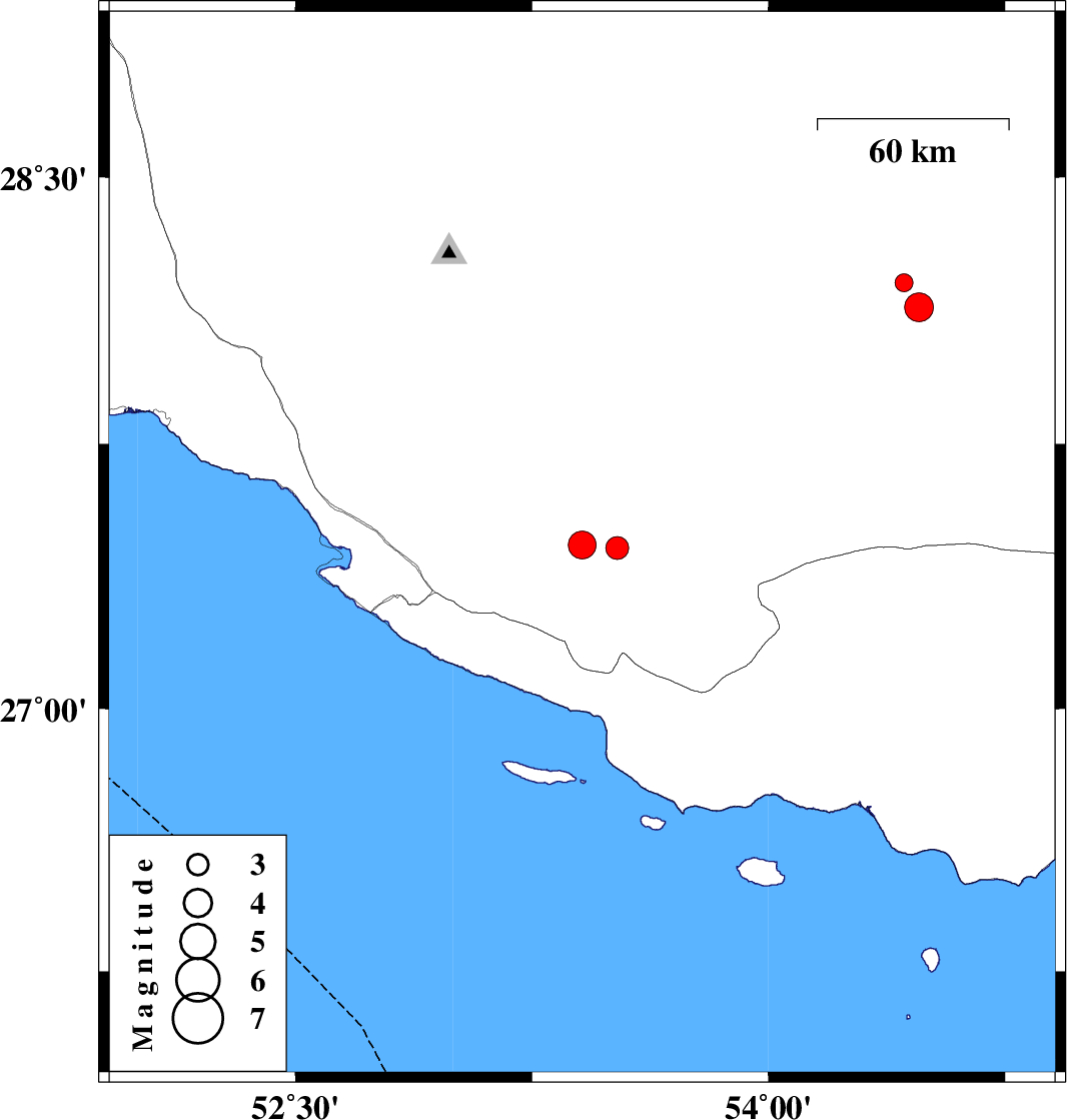 | 2017/08/10 | 13:50:15.3 | 18:20:15.3 | 27.464 | 53.409 | 15 | ML3.9 | Fars Province, 28 km North-East of Lamerd | ||