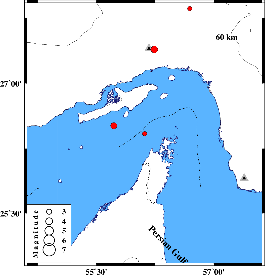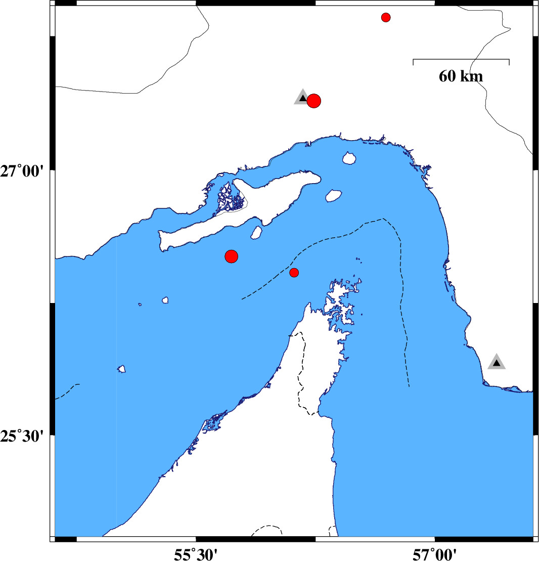 | 2017/08/06 | 09:24:39.6 | 13:54:39.6 | 26.513 | 55.722 | 23 | ML3.6 | Persian Gulf, 87 km -East of Bandar-e lengeh |