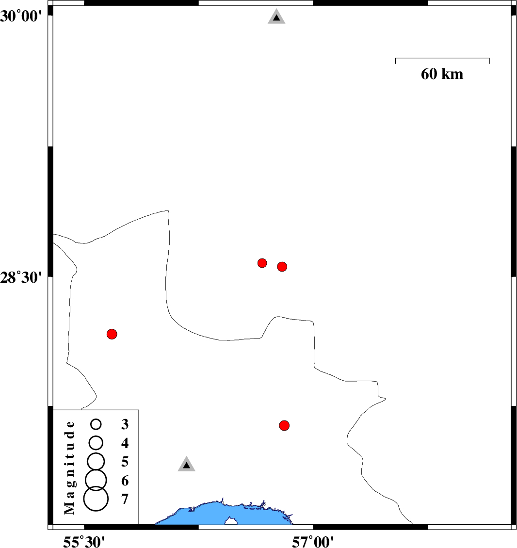 | 2017/08/05 | 21:40:45.6 | 02:10:45.6 | 27.635 | 56.811 | 14 | ML2.9 | Hormozgan Province, 48 km North-West of Dehbarez |