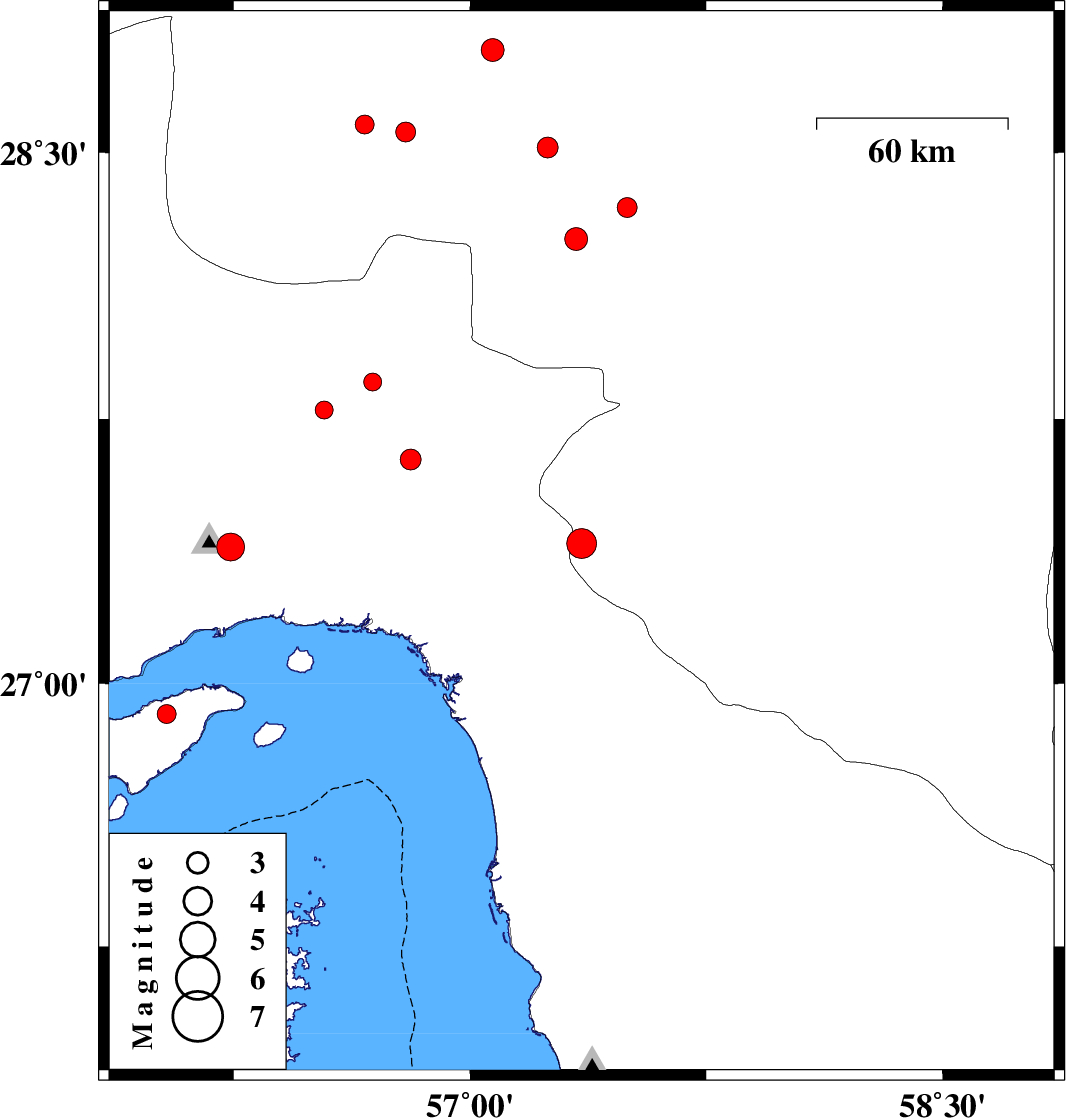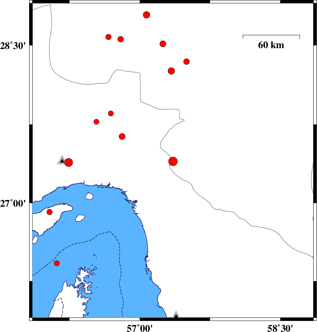 | 2017/08/14 | 11:14:10.3 | 15:44:10.3 | 27.397 | 57.354 | 18 | ML4.2 | Kerman Province, 12 km -East of Dehbarez | ||