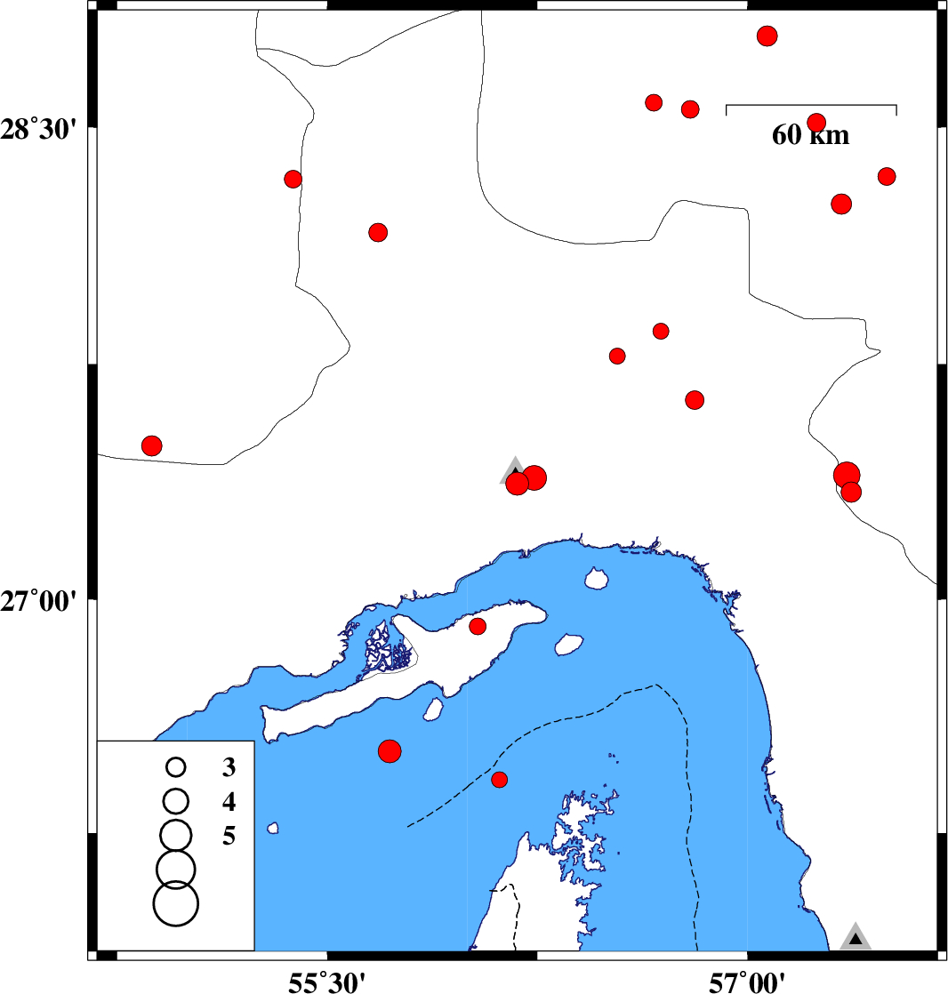 | 2017/08/14 | 11:14:10.3 | 15:44:10.3 | 27.397 | 57.354 | 18 | ML4.2 | Kerman Province, 12 km -East of Dehbarez | ||