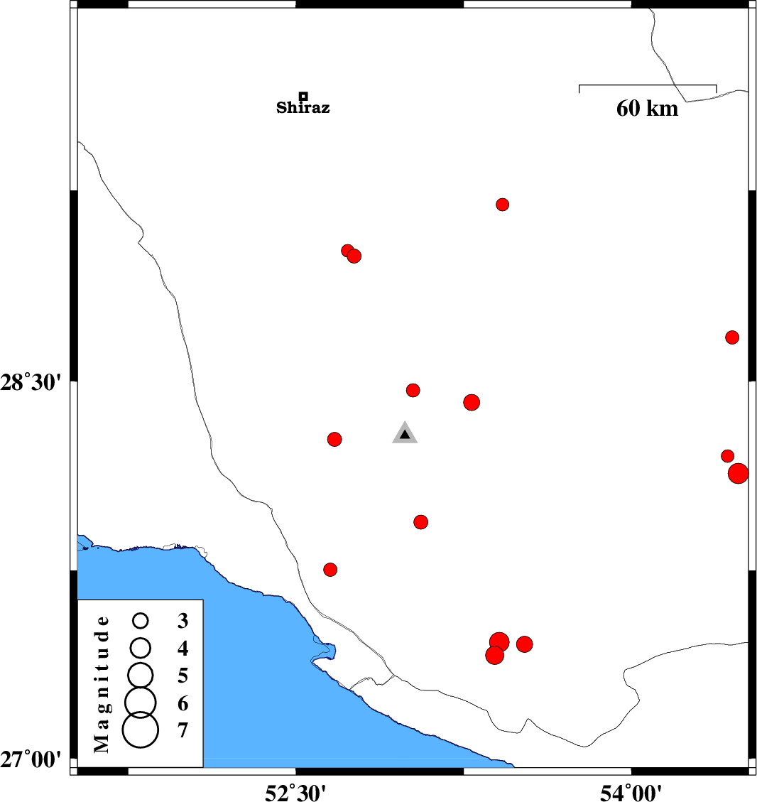 | 2017/07/27 | 02:50:43.6 | 07:20:43.6 | 28.416 | 53.285 | 6 | ML3.2 | Fars Province, 25 km -East of Qir va Karzin |
