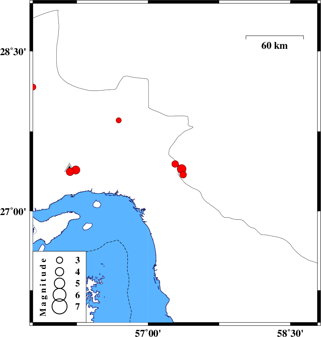 | 2017/08/14 | 11:14:10.3 | 15:44:10.3 | 27.397 | 57.354 | 18 | ML4.2 | Kerman Province, 12 km -East of Dehbarez | ||