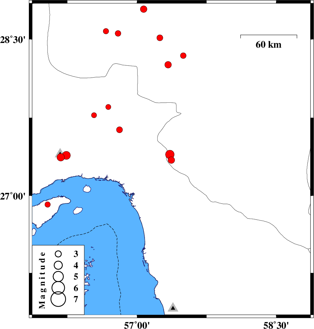 | 2017/08/16 | 13:42:17.4 | 18:12:17.4 | 27.343 | 57.37 | 23 | ML3.2 | Kerman Province, 14 km -West of Manujan | ||