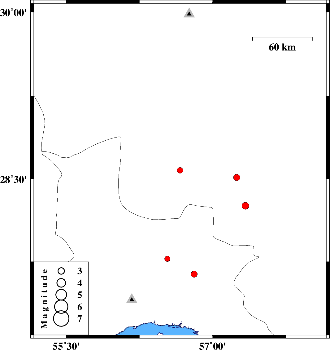 | 2017/08/06 | 10:57:38.3 | 15:27:38.3 | 28.578 | 56.666 | 16 | ML2.7 | Kerman Province, 73 km South of Baft | ||