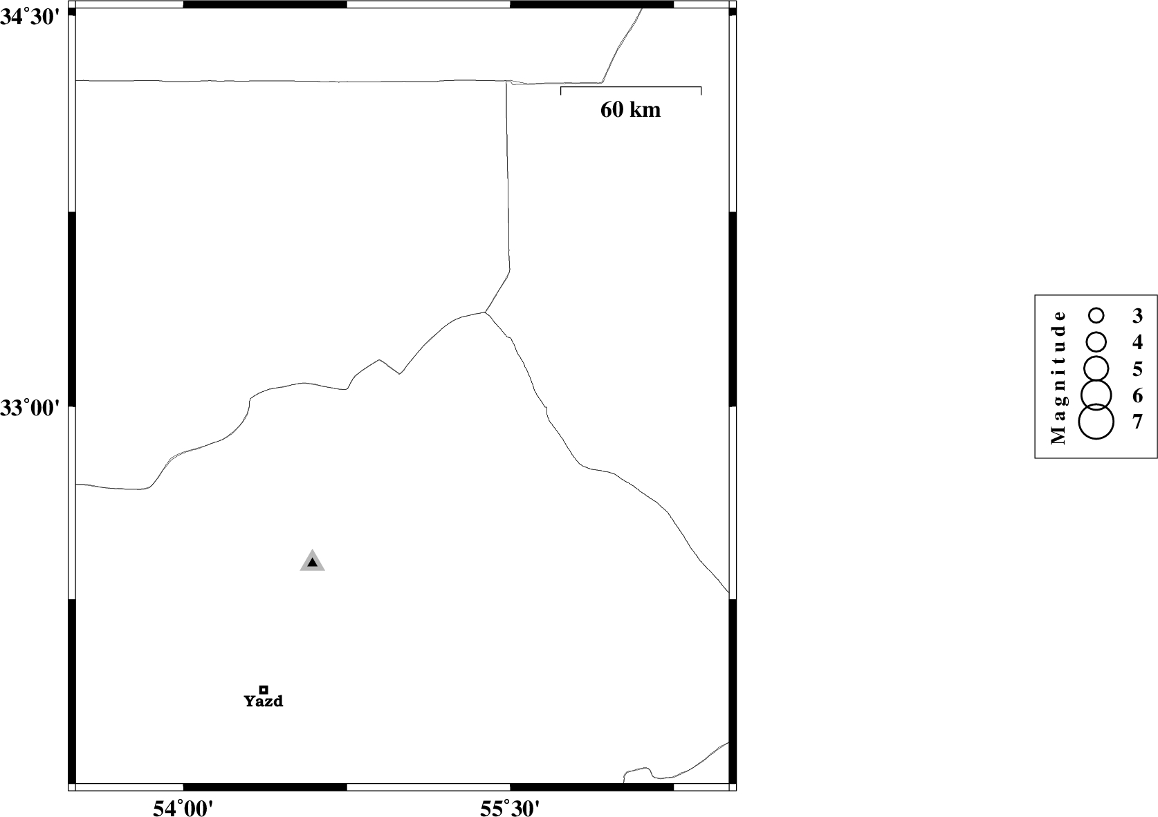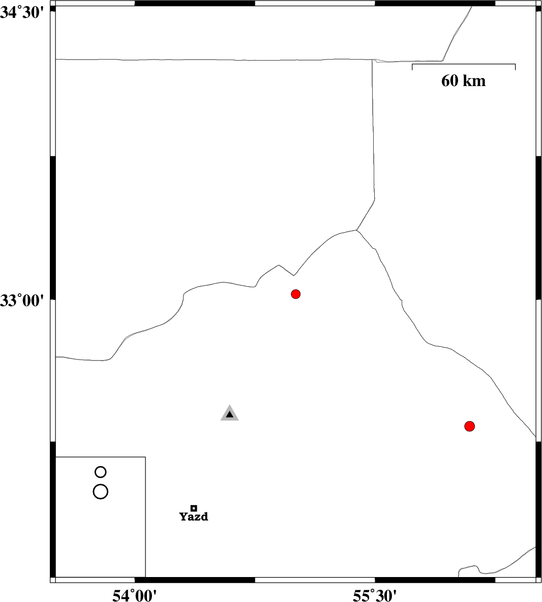 | 2017/08/01 | 00:02:56.8 | 04:32:56.8 | 32.331 | 56.09 | 14 | ML2.8 | Yazd Province, 104 km North-East of Bafq |