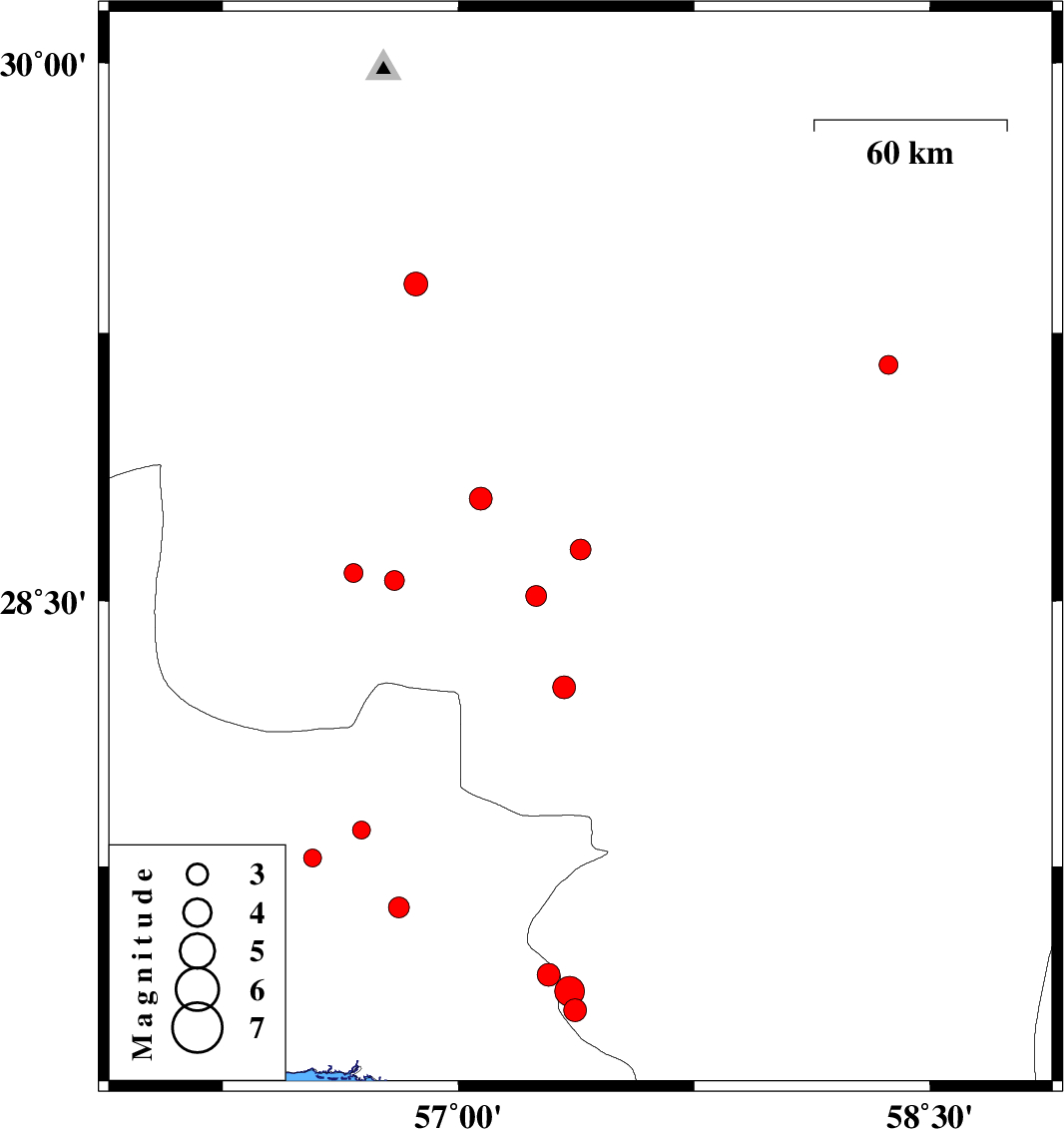 | 2017/08/14 | 11:14:10.3 | 15:44:10.3 | 27.397 | 57.354 | 18 | ML4.2 | Kerman Province, 12 km -East of Dehbarez | ||