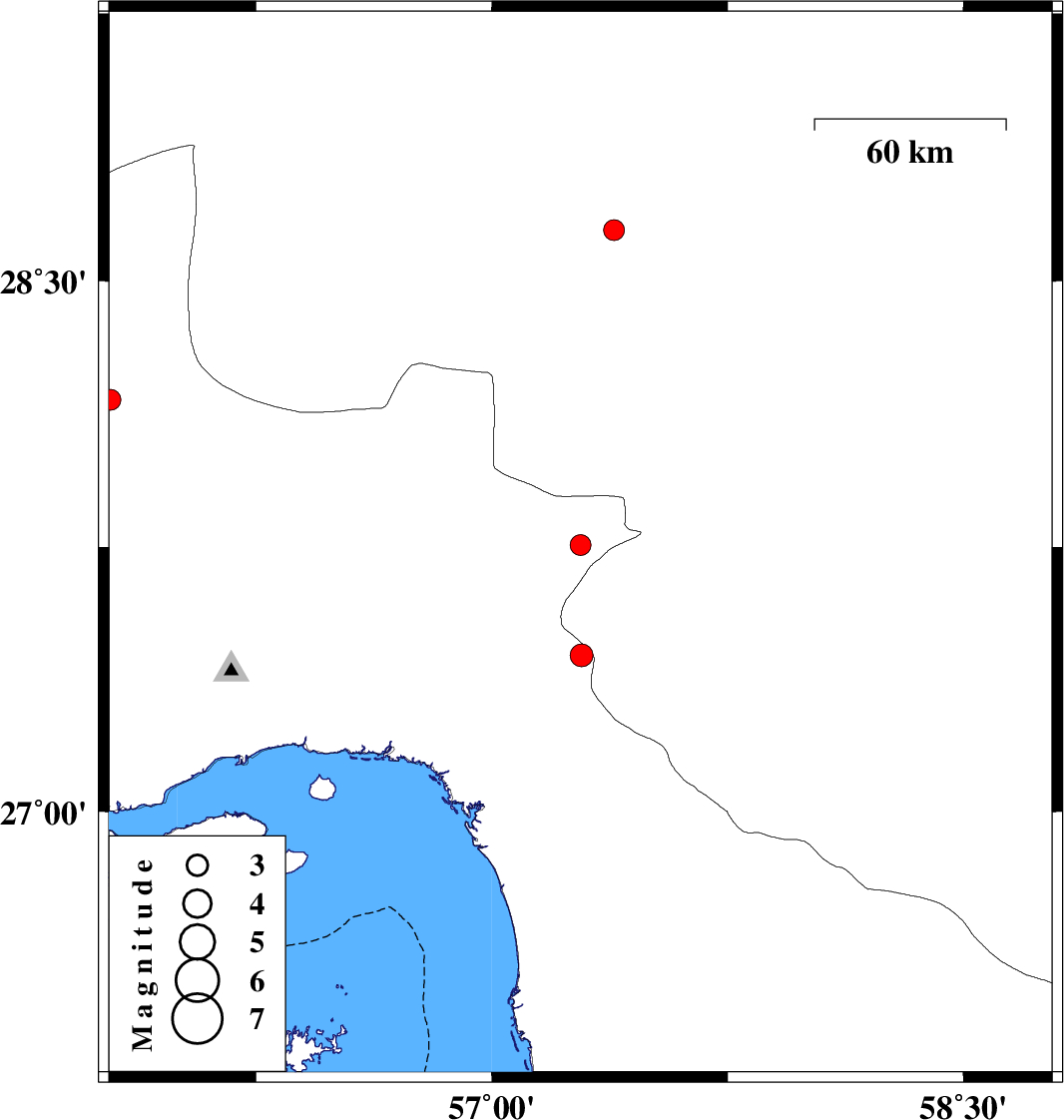 | 2017/08/26 | 00:41:41.1 | 05:11:41.1 | 27.756 | 57.282 | 17 | ML3 | Hormozgan Province, 37 km North of Dehbarez | ||