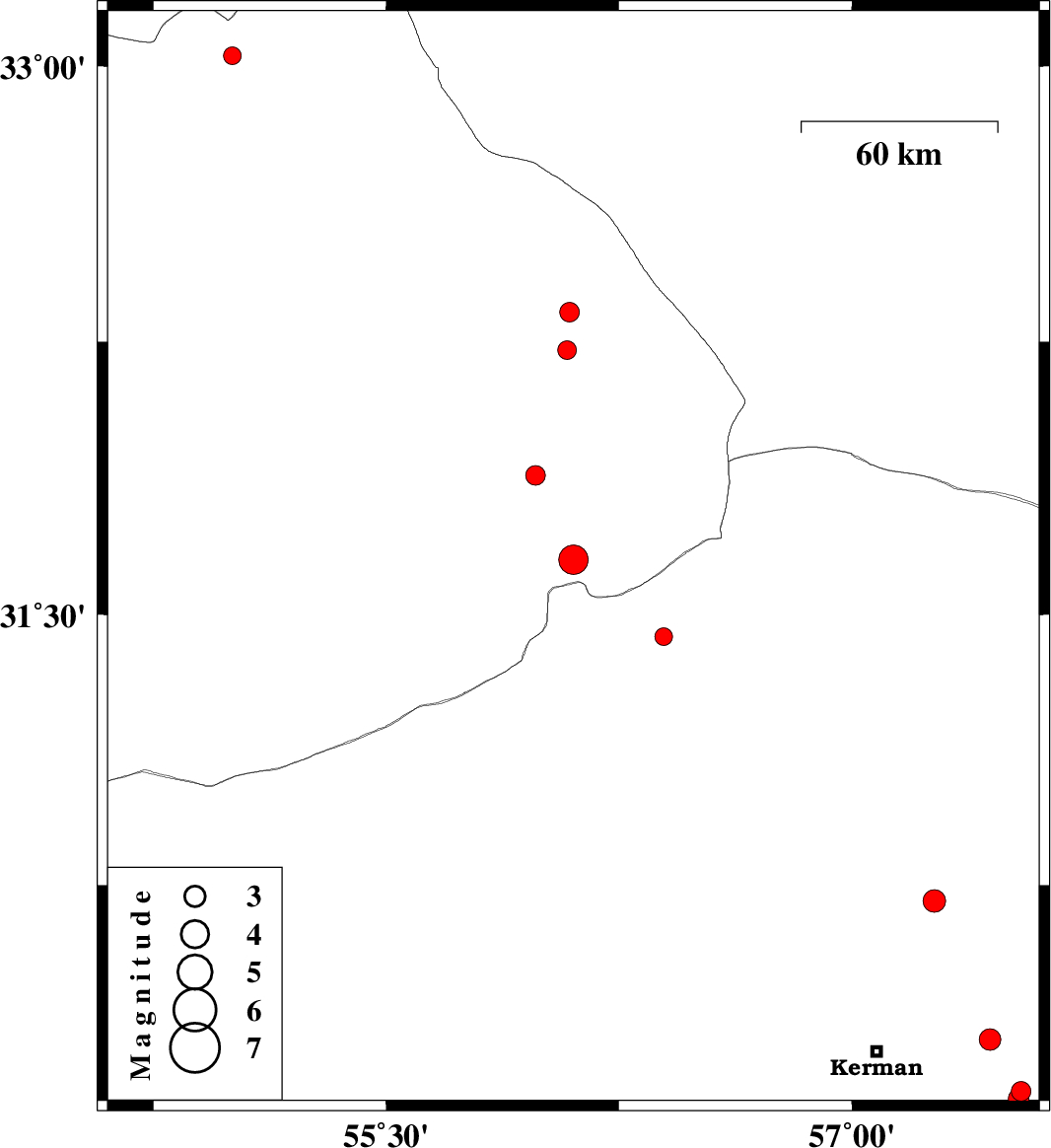 | 2017/07/30 | 07:49:33.9 | 12:19:33.9 | 30.155 | 57.537 | 14 | ML2.9 | Kerman Province, 46 km South-East of Kerman |