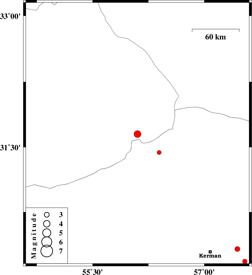 | 2017/08/25 | 10:12:51.9 | 14:42:51.9 | 30.176 | 57.544 | 14 | ML2.8 | Kerman Province, 46 km South-East of Kerman | ||