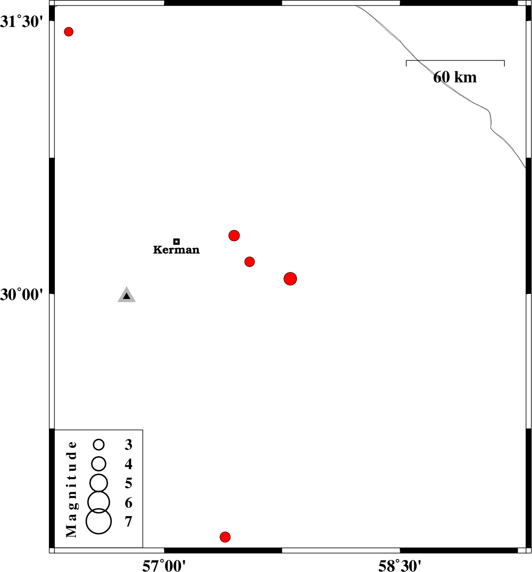 | 2017/08/27 | 21:46:20.4 | 02:16:20.4 | 30.083 | 57.802 | 6 | ML3.7 | Kerman Province, 73 km South-East of Kerman | ||