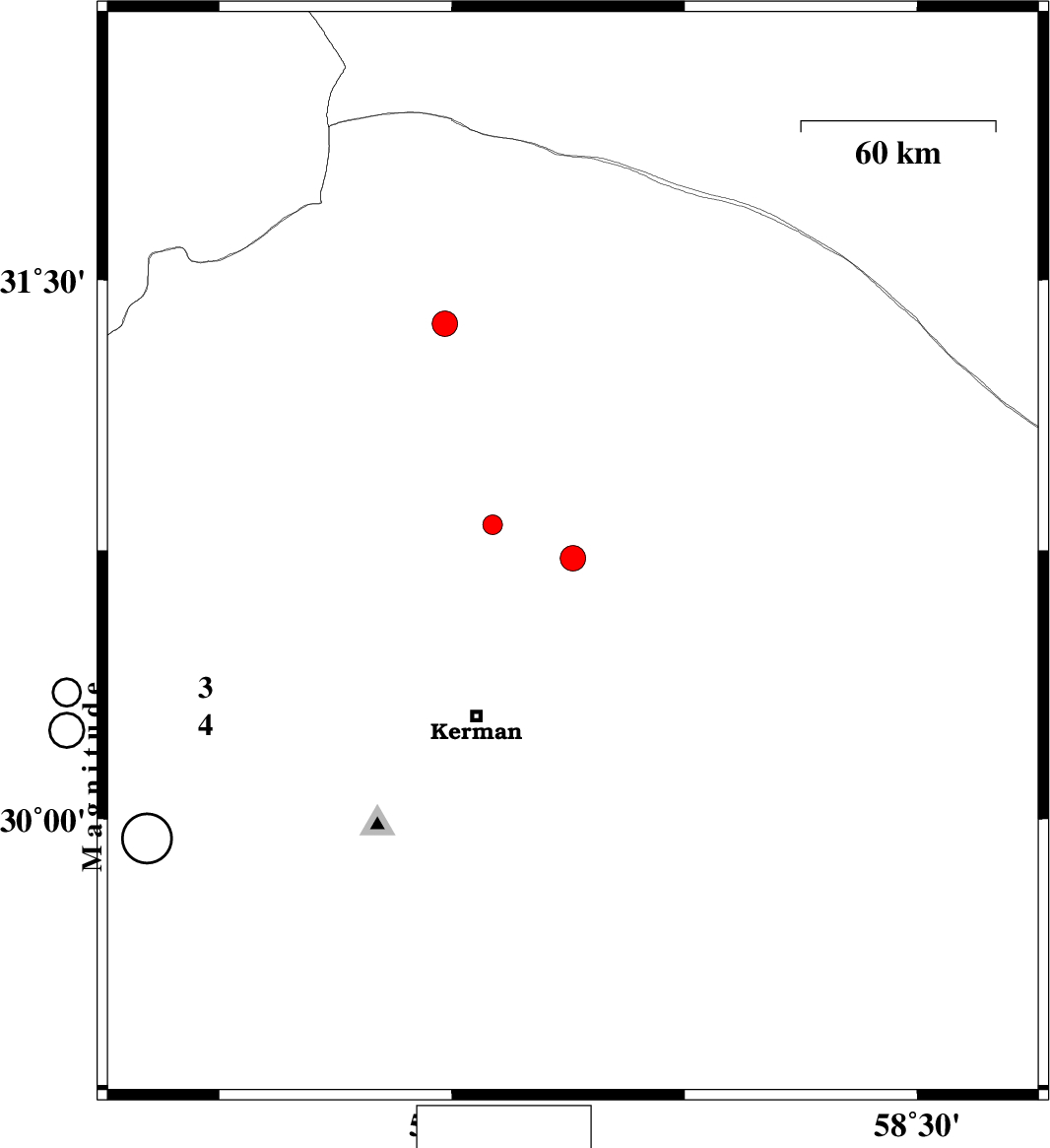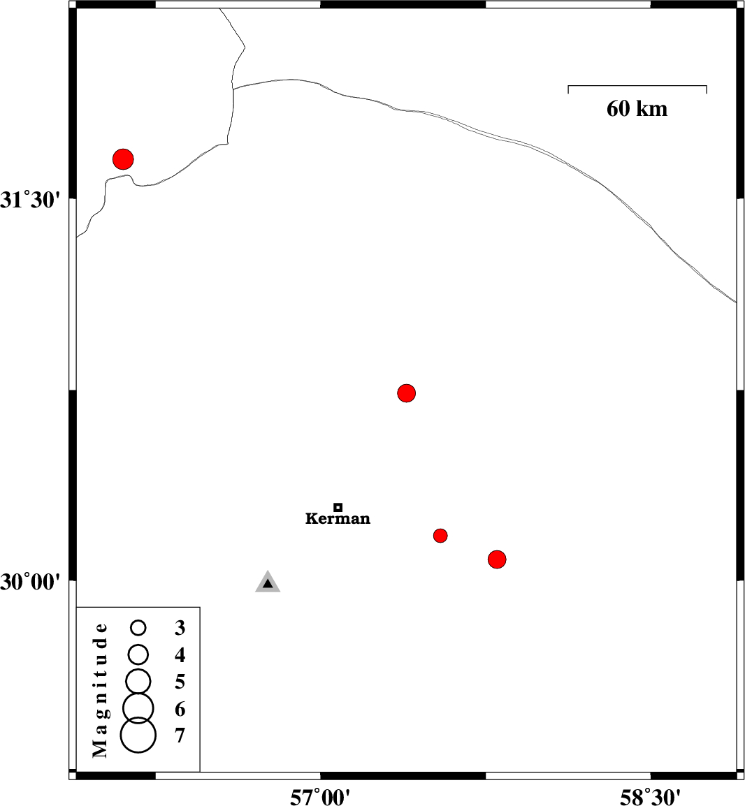 | 2017/08/25 | 10:12:51.9 | 14:42:51.9 | 30.176 | 57.544 | 14 | ML2.8 | Kerman Province, 46 km South-East of Kerman |